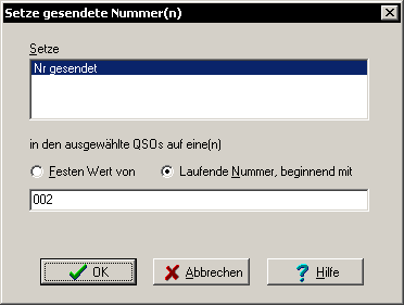 Menü: Bearbeiten | Selektierte QSO(s) | Setze | Gesendete Nummer(n)