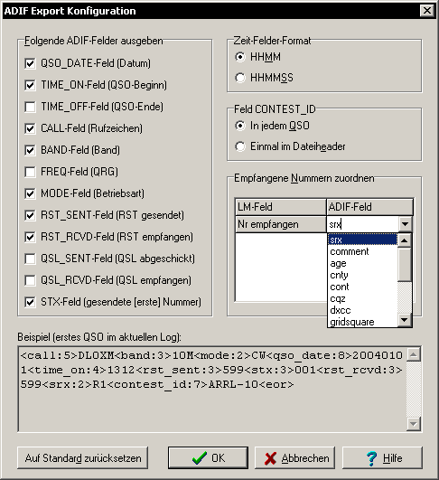 Hier können Sie definieren, welche ADIF-Felder grundsätzlich ausgegeben werden sollen. LM gibt standardmäßig folgende Felder aus: QSO_DATE (Datum), TIME_ON (QSO-Beginn), CALL (Rufzeichen), BAND (Band), MODE (Betriebsart), RST_SENT (RST gesendet), RST_RCVD (RST empfangen), STX (erste gesendete Kontrollnummer), CONTEST_ID (Contestname). Weitere Felder können bei Bedarf zugeschaltet werden. Empfangene Kontrollnummern werden im Dialog gesondert behandelt (siehe Gruppenbox „Empfangene Nummern zuordnen").