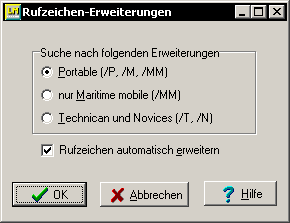Diese Funktion steht nur zur Verfügung, wenn Rufzeichen-Erweiterungen für den aktuellen Contest relevant sind. Beispielsweise sind das Portable-Kennungen (/P, /M, /MM) in den Fieldday-Contesten oder Erweiterungen für Technicans (/T) und Novices (/N) im ARRL-10m-Contest.